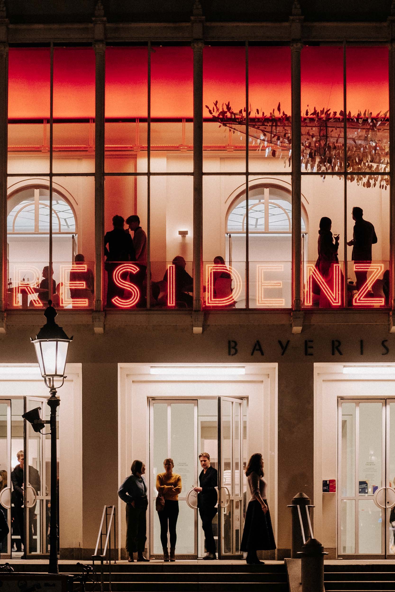 Max-Joseph-Platz is an ideal starting point for exploring Munich through its architecture. The area offers multiple photographic opportunities thanks to the close intersection of the Residenz, the Nationaltheater, and the linear power display of Maximilianstraße, where Maximilianstil architecture frames a long perspective now occupied by luxury stores and hotels. In the late afternoon, light creates long, sharp shadows along the columns of the Nationaltheater facade, interacting naturally with the steady flow of people attending performances or passing through the square. In the evening, the Residenz Theatre becomes particularly cinematic, with its bright red neon sign and fully transparent glass front standing out against the surrounding classical architecture. Silhouettes emerging against the backlit facade can result in strong and cinematic images.