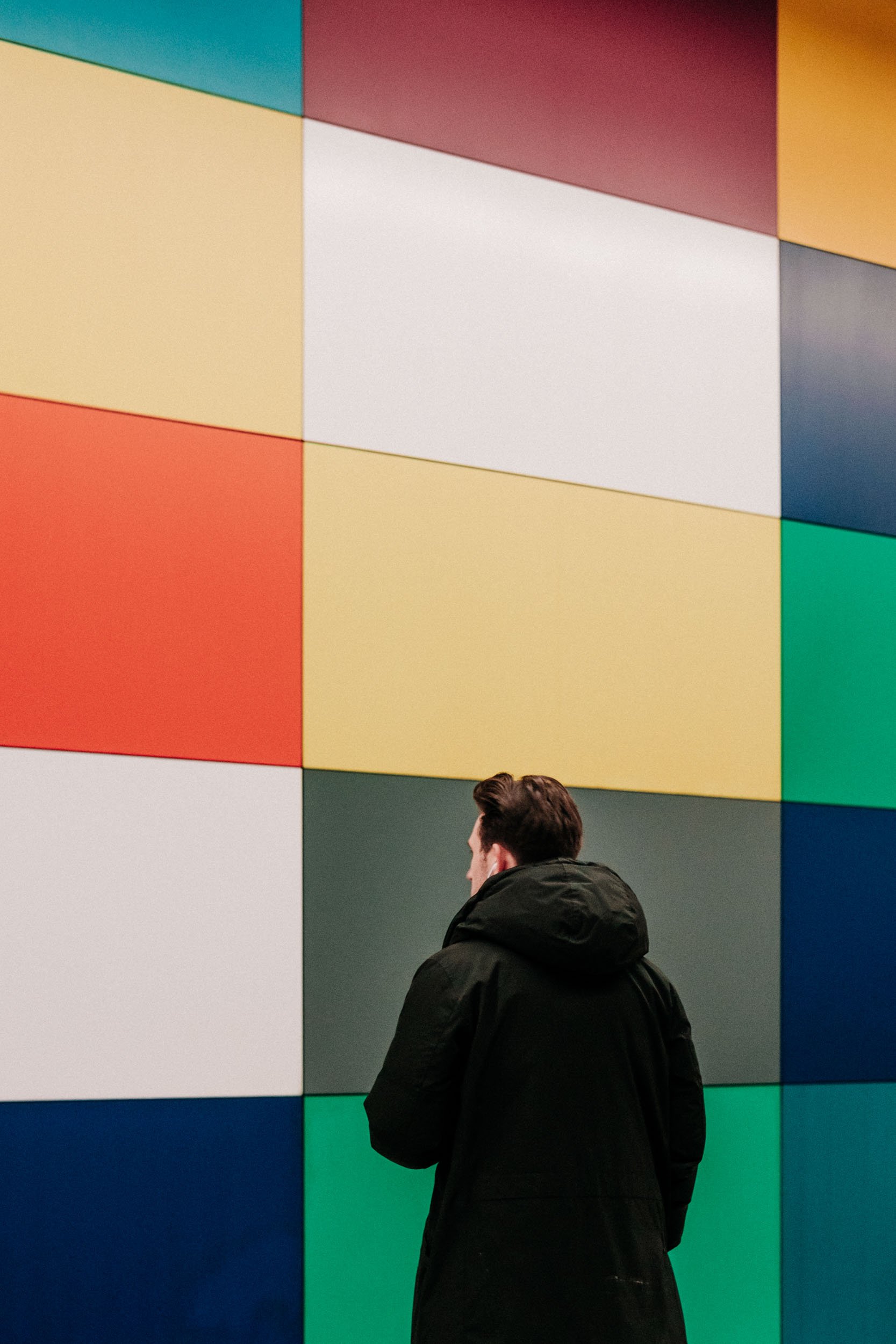 Georg-Brauchle-Ring moves in a very different direction. Quieter and far less crowded, the station is defined by its high ceiling, vast central chamber and extended platforms. Large, multicoloured checkered walls dominate the space, reducing waiting passengers to small, isolated figures within the monumental scale of the architecture. From a street photography perspective, the focus shifts to framing people against these coloured surfaces and exploring the contrast between human scale and the overwhelming vastness of the space.