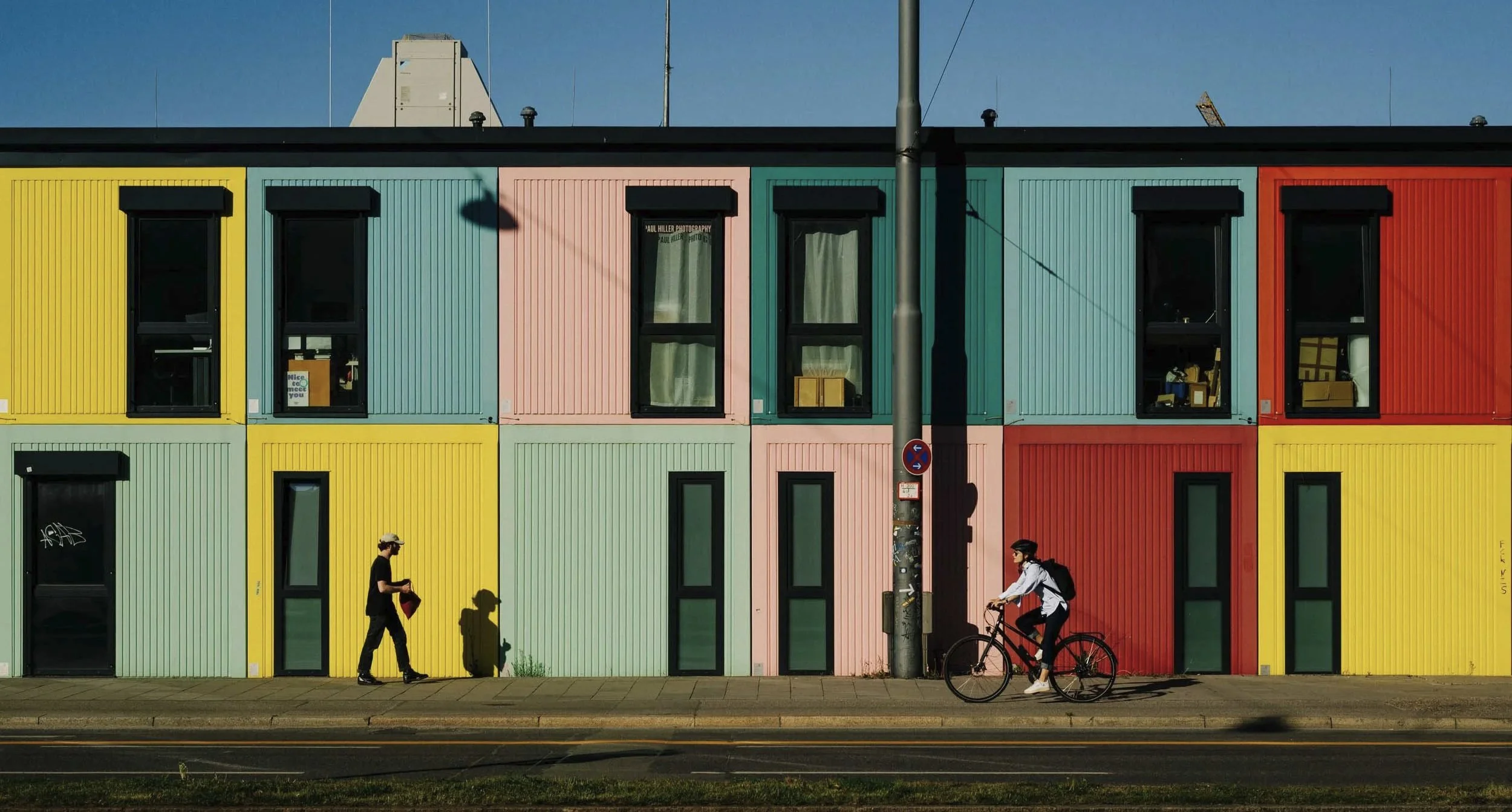 Post-war architecture becomes a framework for routine, offering street photography a setting where function, light and human presence intersect.